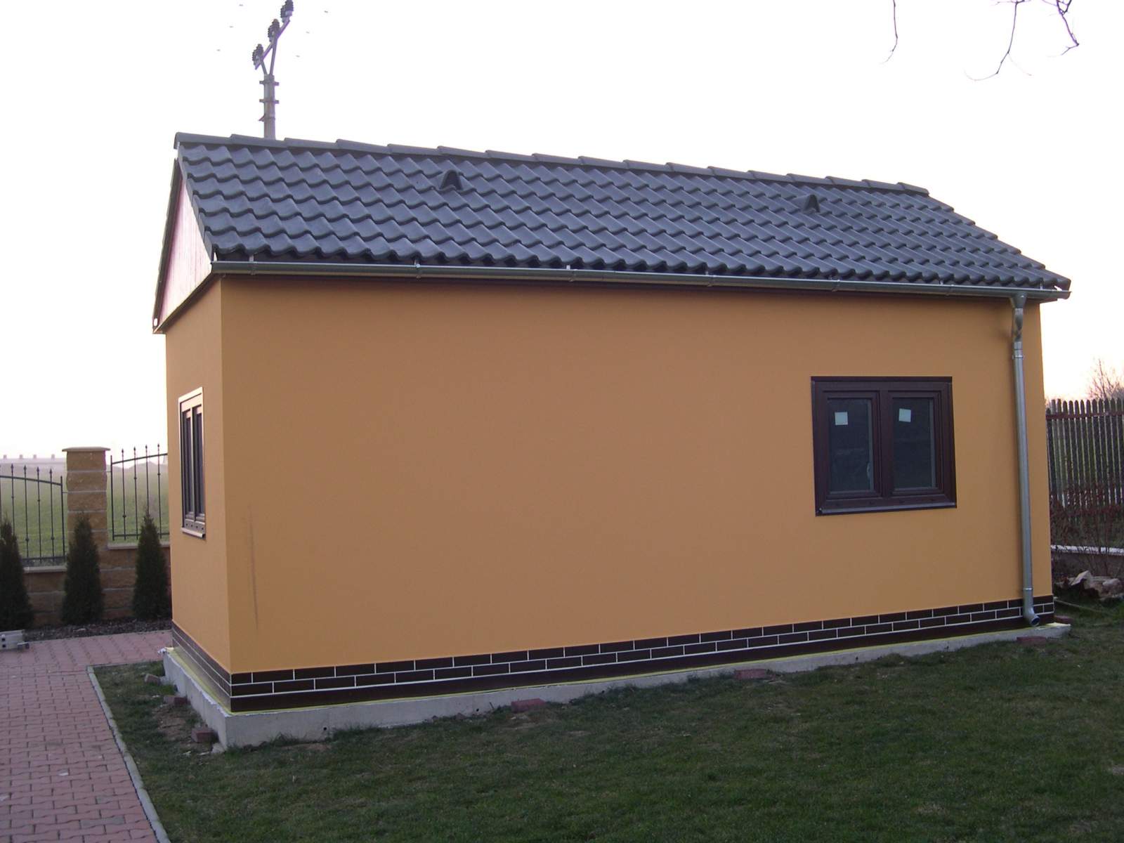 Constructions made of cellular concrete with final facade, inner walls coated with lime plaster and regular paint job. Framed with door and windows. Hip, open gable or shed roof. PVC floor tiling. Maximum width is limited to 3 meters due to transportation. Sheds are shipped in two complete parts, bottom and roof part. Manipulation is done with an auto crane.